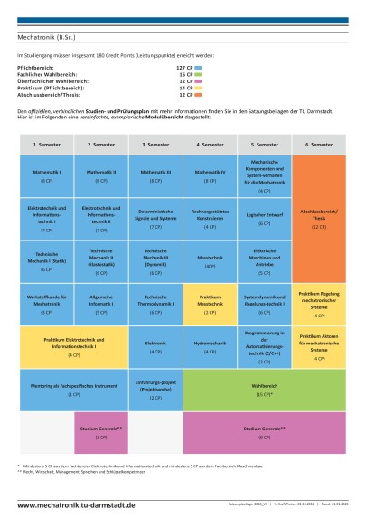 Diese Seite dient nur der allgemeinen Information über den Studiengang Bachelor of Science Mechatronik. Verbindlich sind die Regelungen in den Ausführungsbestimmungen des Bachelor of Science Studienganges Mechatronik zu den Allgemeinen Prüfungsbestimmungen der Technischen Universität Darmstadt (APB) in der aktuell gültigen Form.